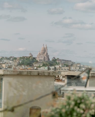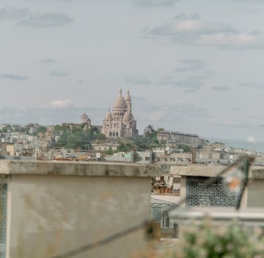 La terrasse prolonge cette sensation d’ouverture, tandis que le rooftop offre une vue dégagée sur les toits de Paris et le Sacré-Cœur.