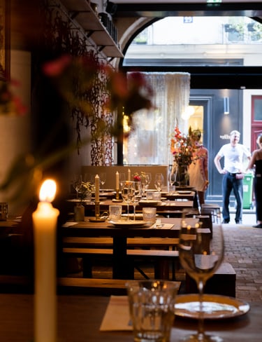 La journée se termine chez Shana. Un restaurant-bar à vins parisien intime, où l’ambiance change doucement à la tombée du soir. Les bougies s’allument, les tables se réchauffent, la lumière devient plus douce dans l’air.